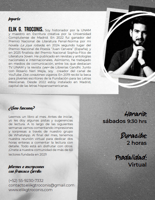 «Mes con mes Elik nos lleva a recorrer el mundo y viajar en el tiempo a través de diferentes libros. Siempre queremos más ante tanto que comentar y analizar de cada libro. Elik nos guía en las sesiones, explicando contextos y el texto. Ningún libro te dejará indiferente».